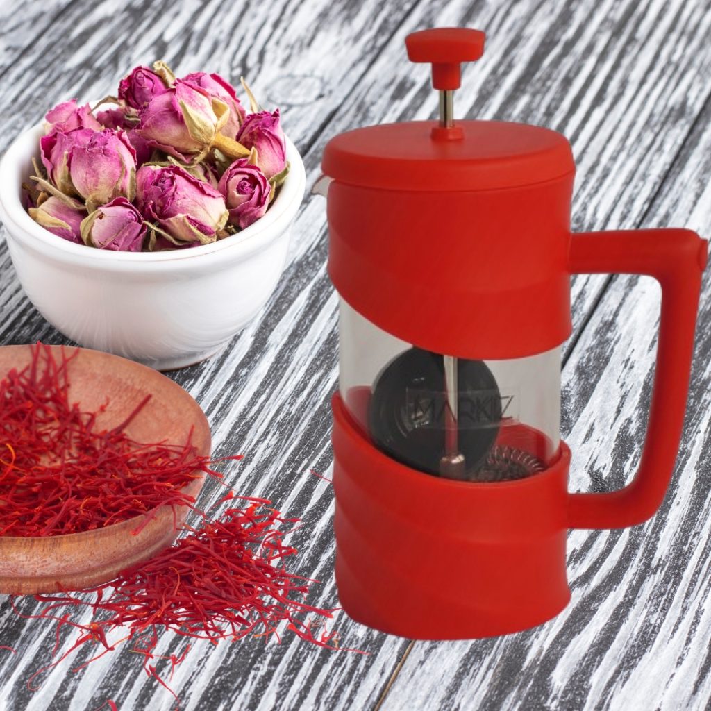 - زعفران و گل محمدی را در فرنچ پرس بریزید.