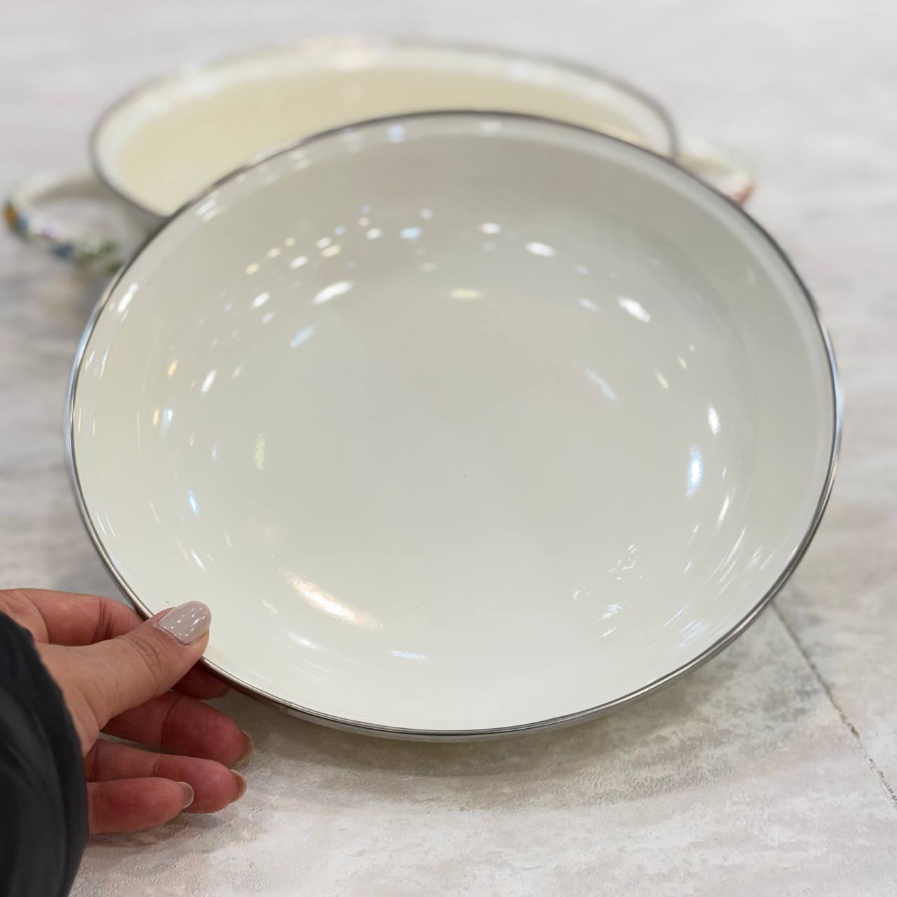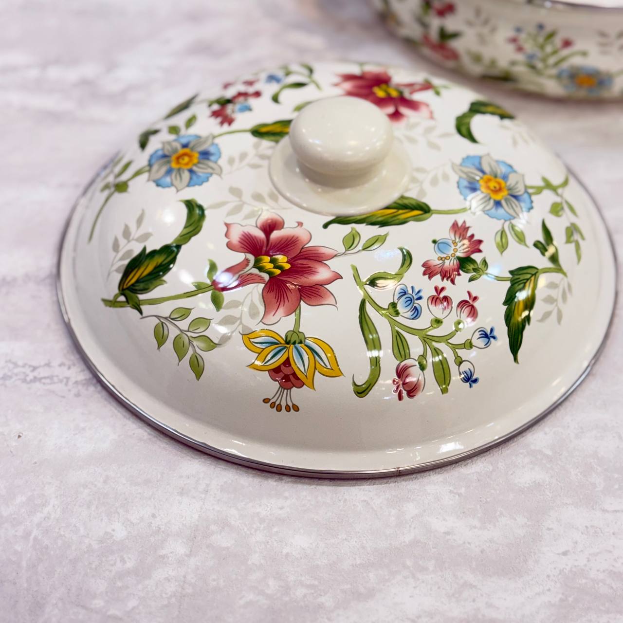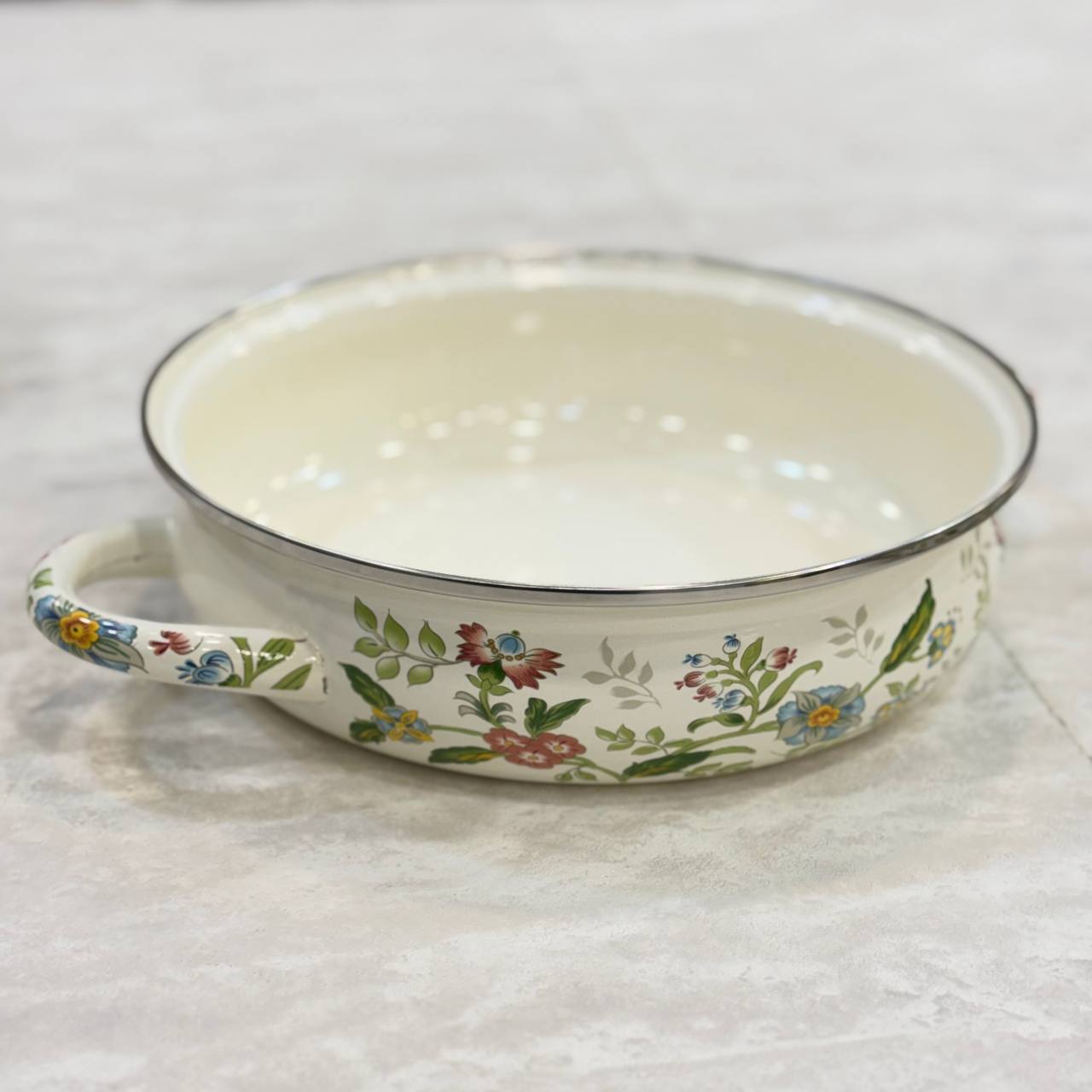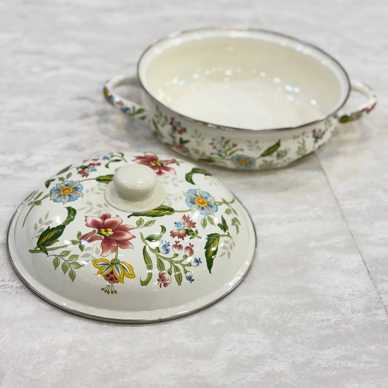 تابه دو دسته لعابی گلدار ترکیبی چشمنواز از ظرافت و کارایی است که میتواند جلوهای خاص به آشپزخانه شما ببخشد. طراحی گلدار این مدل، حس لطافت و زیبایی را به فضای آشپزی اضافه میکند و در کنار بدنهی لعابی باکیفیت، ظاهری براق و دلنشین ایجاد میکند. پوشش لعاب مقاوم آن در برابر حرارت عملکردی مطمئن داشته و برای پختوپز روزمره کاملاً کاربردی و قابل اعتماد است.