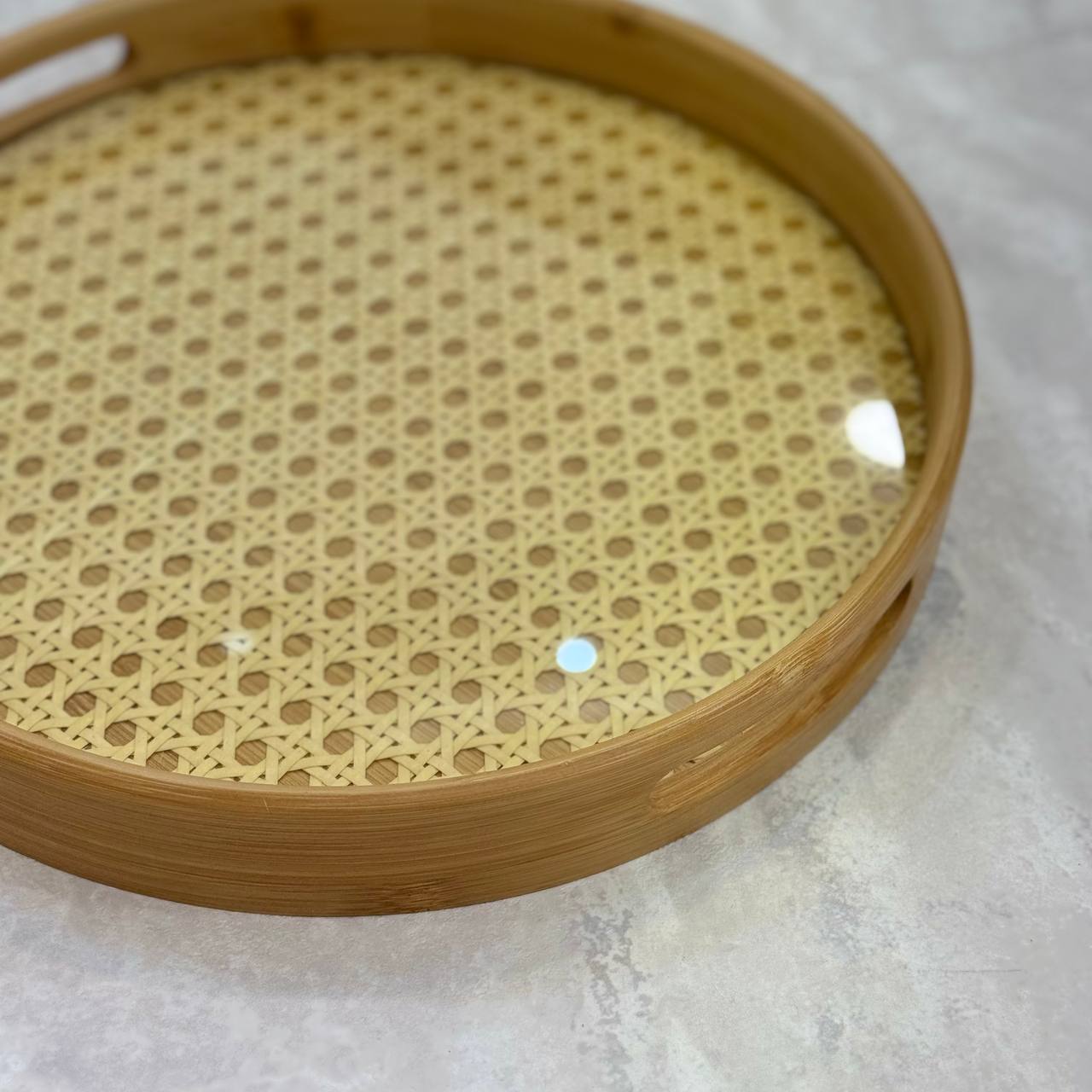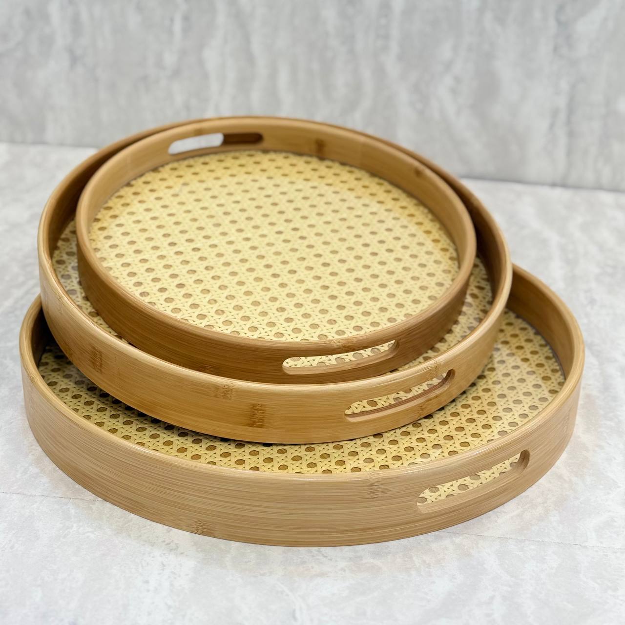 سینی گرد بامبو سه سایز با طراحی مدرن و الهامگرفته از طبیعت، جلوهای شیک و دلنشین به میز پذیرایی و دکوراسیون خانه میبخشد. کف حصیری که بین دو لایه اکرولیک قرار گرفته است، ترکیبی از زیبایی و استحکام ارائه کرده و حس طبیعی و گرم به محیط منتقل میکند. جنس بامبو و اکرولیک باکیفیت، دوام و ماندگاری بالا را تضمین میکند.