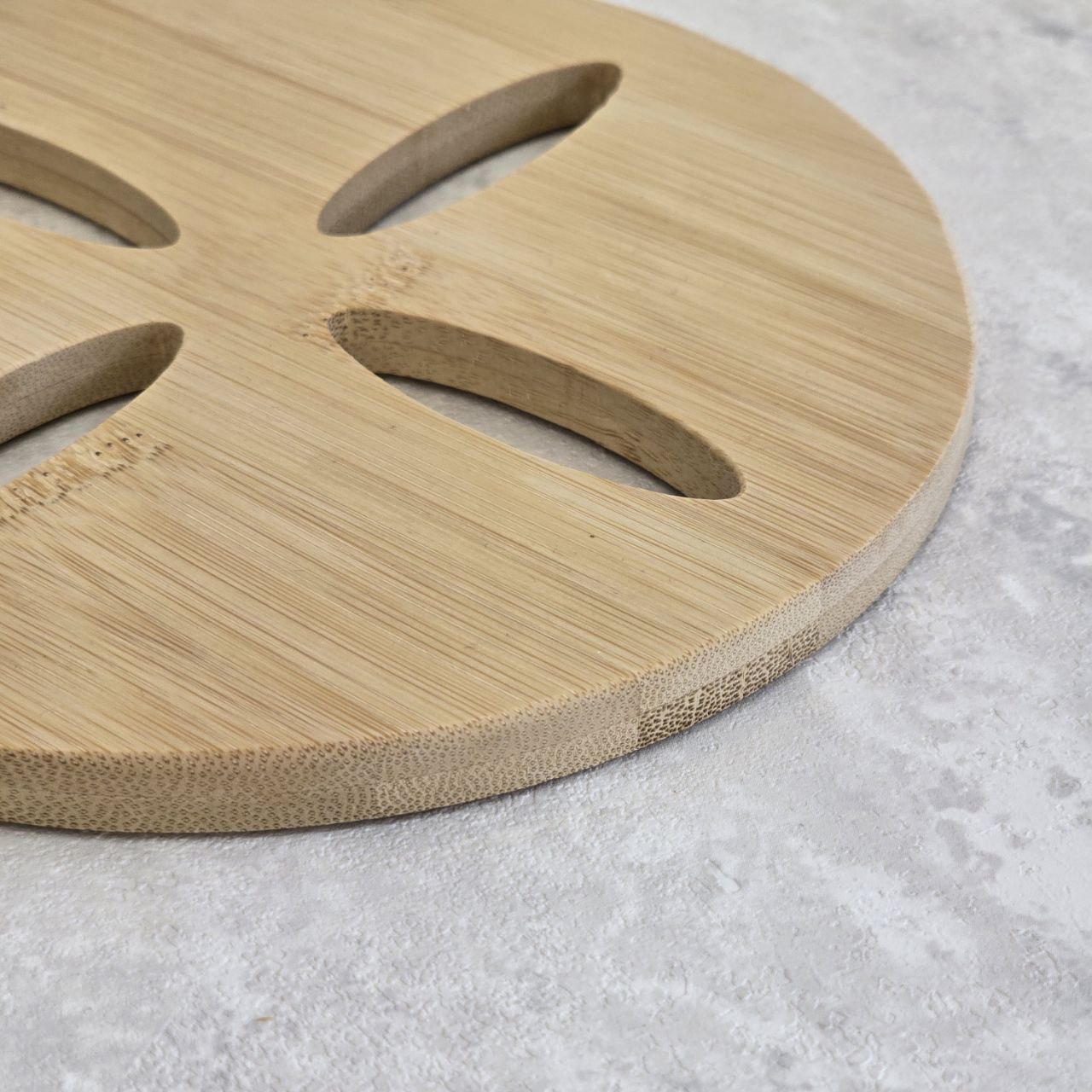 زیر قابلمه‌ای بامبو از جنس بامبوی طبیعی، ترکیبی از زیبایی و مقاومت را به آشپزخانه شما می‌آورد. این محصول با طراحی ساده و شیک خود، محافظی مطمئن برای سطوح میز و کانتر در برابر حرارت قابلمه‌ها و ظروف داغ است.